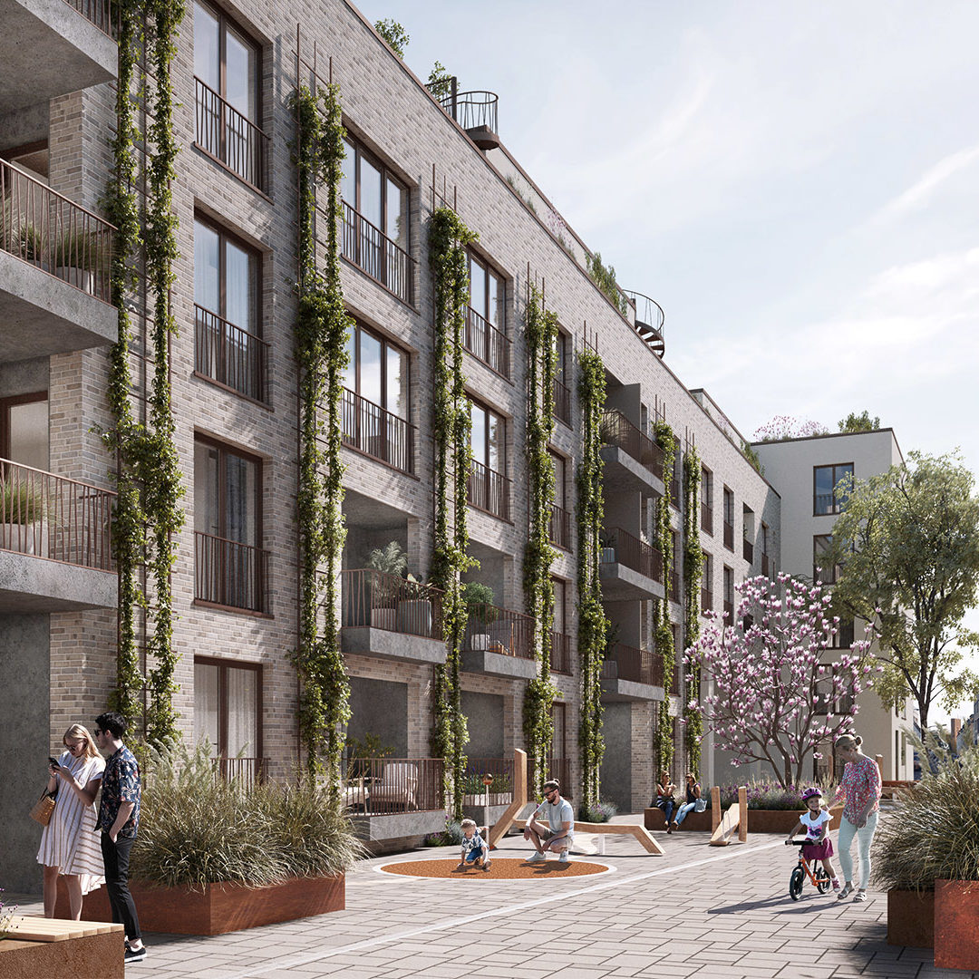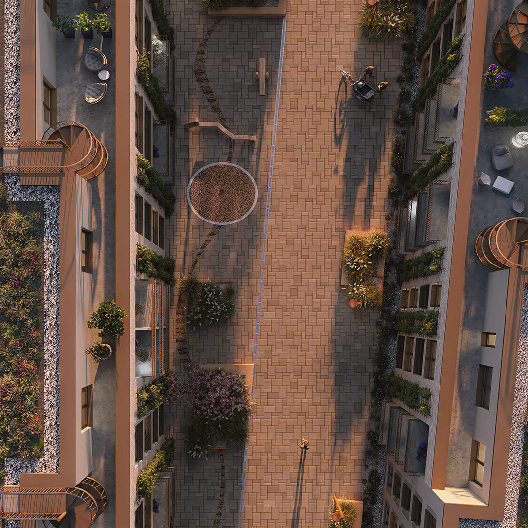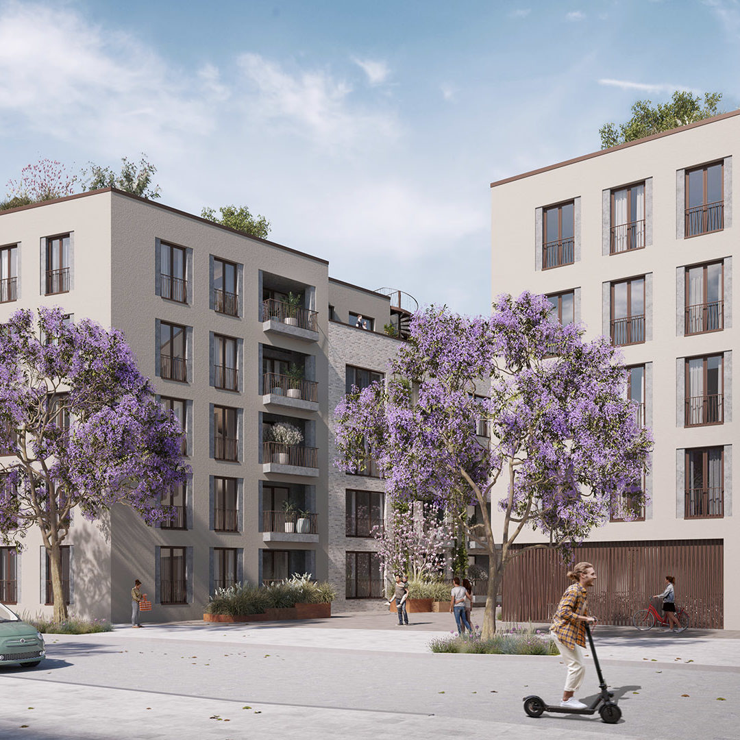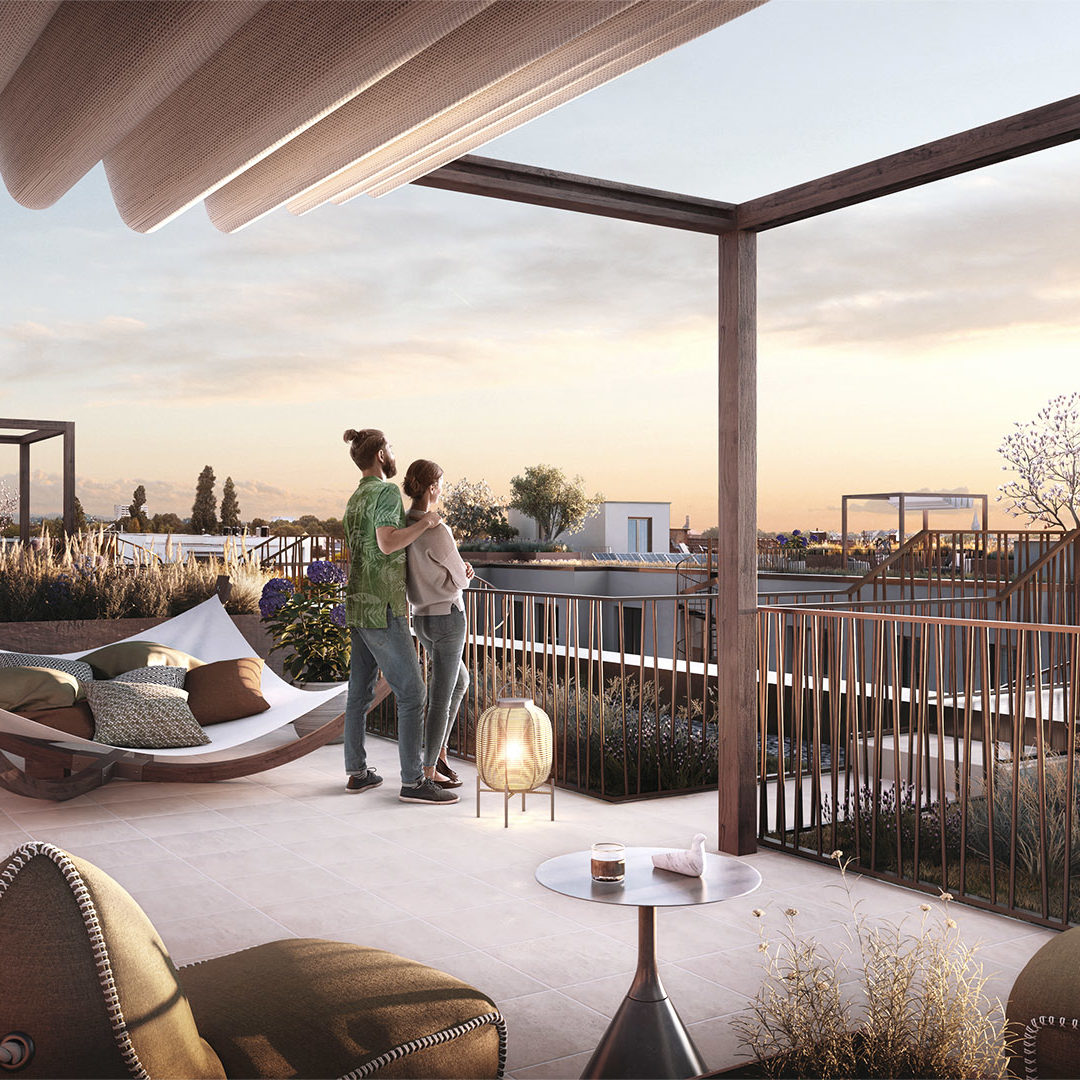 Die WOHNLiebe bietet alles, was das Leben in der Stadt schöner macht: einen großzügig begrünten Korridor, ebenerdige Fahrrad-Stellplätze mit Ladestationen für E-Bikes, private Kleinkinderspielplätze, teilbegrünte Fassaden sowie Vorgärten und private Grünflächen hinter dem Gebäude. Was die Herzen aber ganz besonders höherschlagen lässt, sind die begrünten Dachgärten zur gemeinschaftlichen und individuellen Nutzung, auf denen Terrassenflächen, Sitznischen und Holzpergolen zum Verweilen über den Dächern Köln-Ehrenfelds einladen.