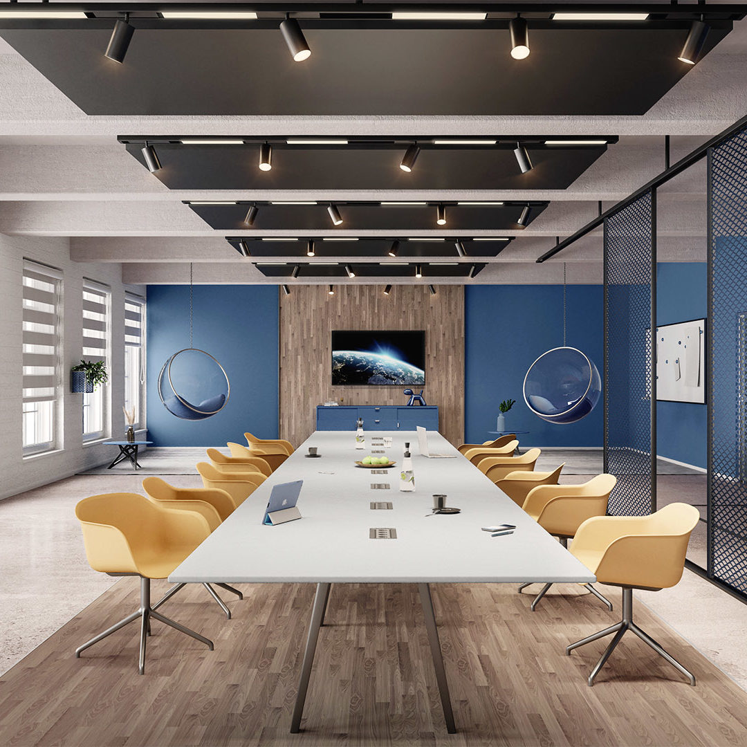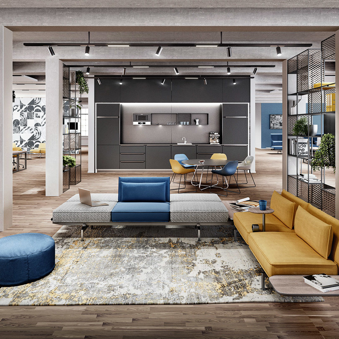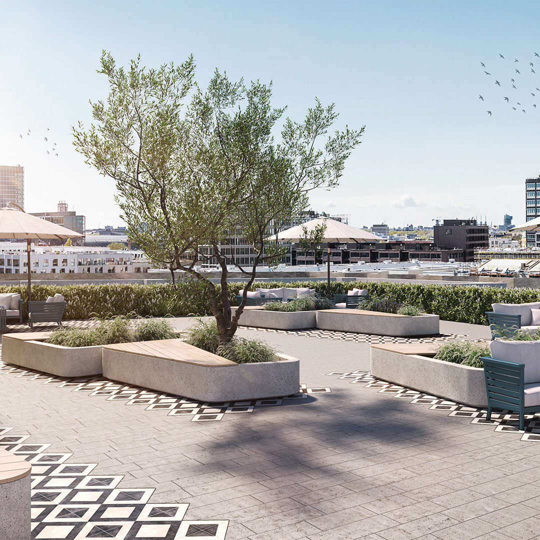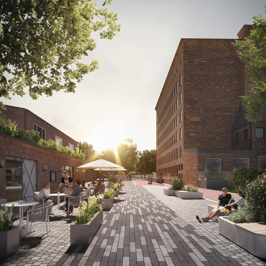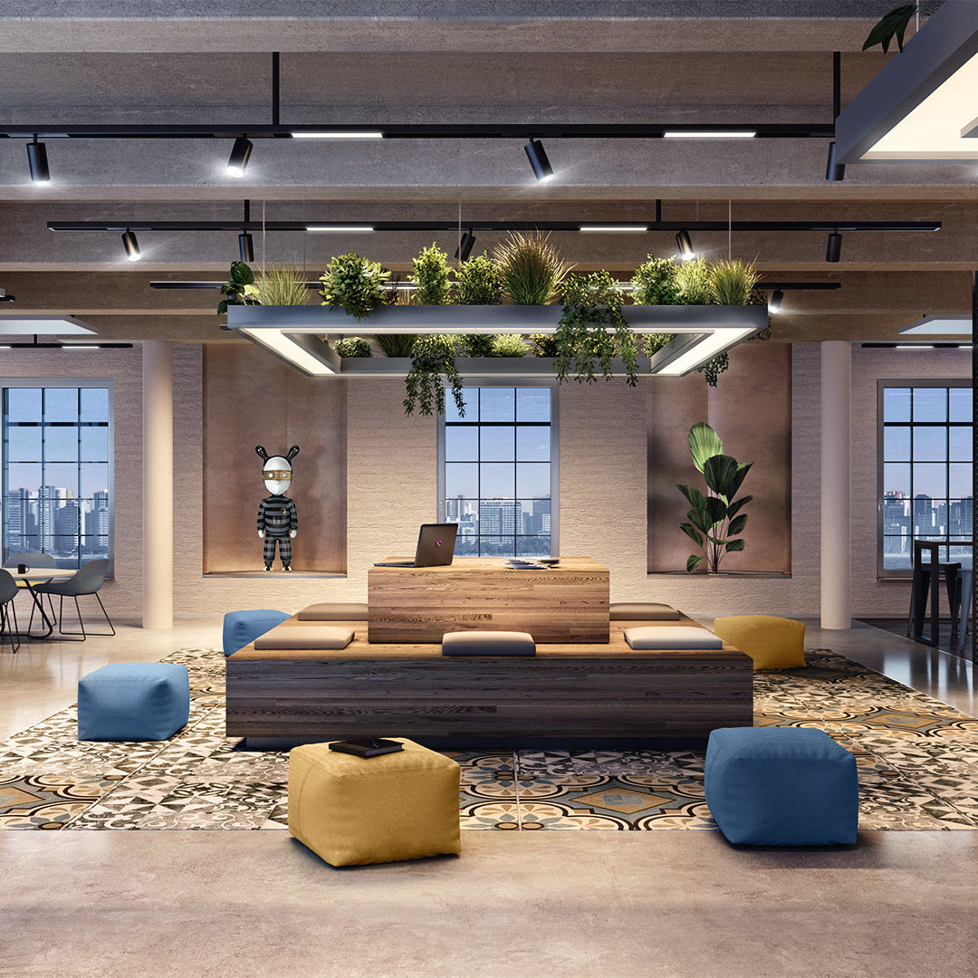 Vor diesem Hintergrund beauftragte uns UNIT III mit der Visualisierung diverser Räume der LICHTWARTE. So konzipierten wir ein repräsentatives Foyer, bei dem der Name LICHTWARTE Programm ist, und entwarfen hochmoderne, grüne New Work Offices, Open Spaces und Konferenzräume, die eine Idee vom Arbeiten in der Zukunft geben. Auch im Außenbereich visualisierten wir unsere Vision der einladenden Skylounge und inszenierten die Umnutzung der alten Fabrikhalle hin zu einem kleinen Café mit Aufenthaltsqualität.
